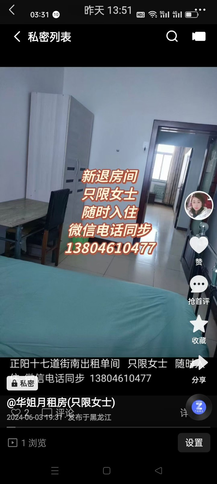 正陽十七道街銀行樓出租單間 只限女士 隨時入住 微信電話同步13804610477