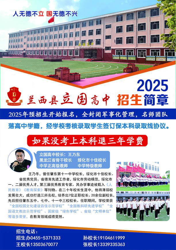 蘭西縣立國藝術(shù)中學(xué),一校區(qū)位于蘭西縣福和城6號(hào)樓附近(二校區(qū)待建中),校園占地面積7000平方米。其中綠化面積400平方米,運(yùn)動(dòng)場地面積3785平方米。建筑面積3652平方米,其中教學(xué)樓3400平方米,警務(wù)室、倉庫(板房)等260平方米。功能室、教育教學(xué)設(shè)施齊全,共有領(lǐng)導(dǎo)辦公室6個(gè)。功能室16個(gè)(包括音、體、美器材室;音、體、美教室;理、化、生實(shí)驗(yàn)室3個(gè)及理、化、生實(shí)驗(yàn)準(zhǔn)備室儀器室3個(gè)、健康體檢室、閱覽室(2個(gè))、圖書室、檔案室、微機(jī)室和多功能報(bào)告廳)。教學(xué)樓還內(nèi)設(shè)財(cái)務(wù)室、主控室、儲(chǔ)藏室、衛(wèi)生間。