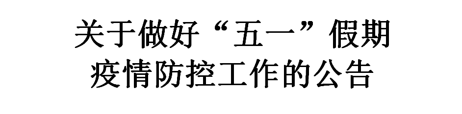 為切實做好“五一”期間新冠肺炎疫情防控工作,認真落實好“外防輸入、內防反彈”嚴十條要求,切實保障人民群眾身體健康,現將有關事宜公告如下。
