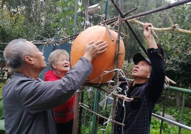 收獲時,左鄰右舍都來幫老人摘瓜。兩個中年人費好大勁兒,才將這個“瓜王”從鐵制瓜架子上抬下來。