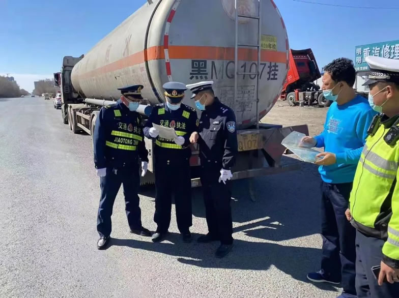 聯合執(zhí)法行動中,交通執(zhí)法大隊副大隊長刁大偉和交警大隊副大隊長曲斌帶隊,采取定點檢查與流動巡查相結合的方式,嚴查客車、貨車、危化品運輸車輛“三超一疲勞”、酒駕醉駕、違法改裝、超載超限等嚴重交通違法行為。形成嚴查、嚴管、嚴控的高壓態(tài)勢。執(zhí)法人員對重點車輛的外觀裝置、車輛輪胎,滅火器等安全設施配備情況,危化品運輸車緊急切斷裝置狀態(tài)等進行全面檢查。同時仔細核查駕駛員和押運員檔案、駕駛資格、從業(yè)資格,交通違法記錄、車輛日常維護保養(yǎng)情況,提醒司機自覺遵守交通規(guī)則,切實提高安全文明行車意識和責任意識,全力預防和遏制重點運輸車輛重特大道路交通事故發(fā)生。