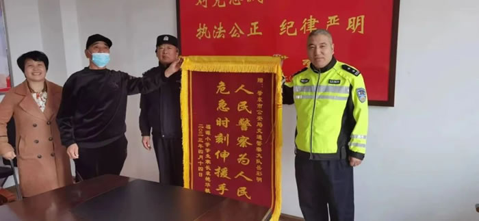 “謝謝,真是太感謝警察同志了!”第二天學生家長袁女士將一面印有“人民警察為人民,危急時刻顯身手”的錦旗送到肇東市公安局交警大隊民警岳彩明的手中,對民警救助孩子表示感謝。