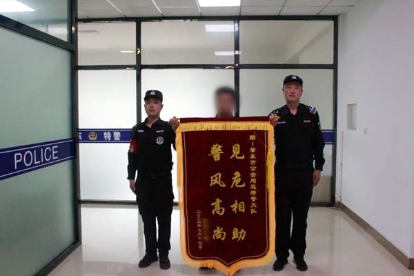 8月10日,齊齊哈爾市民張先生來到肇東市公安局巡特警大隊,將一面印有“見危相助,警風高尚”的錦旗送到巡特警隊員手中,以表感激之情。