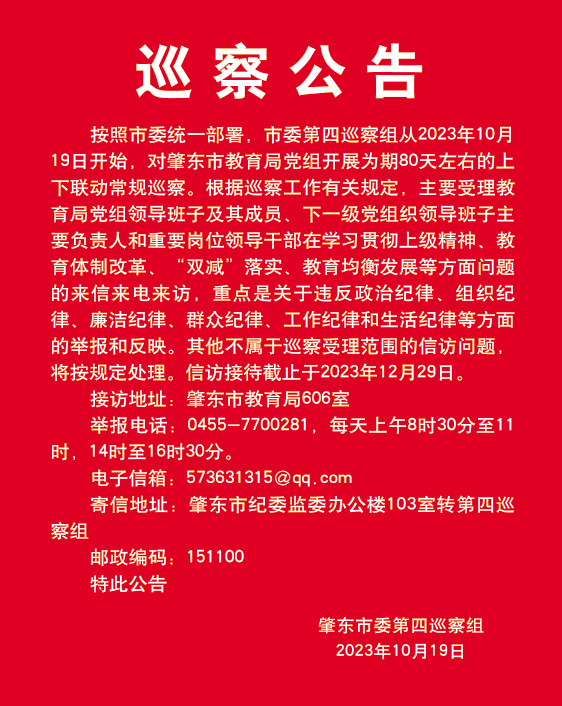 2023年10月19日上午,市委第四巡察組對(duì)市教育局黨組巡察工作動(dòng)員會(huì)議在市教育局召開。市委巡察工作領(lǐng)導(dǎo)小組成員劉向軍,市委第四巡察組組長(zhǎng)李偉宏出席會(huì)議并講話,對(duì)此次巡察工作的重大意義、目標(biāo)任務(wù)、方法步驟做出了具體要求。