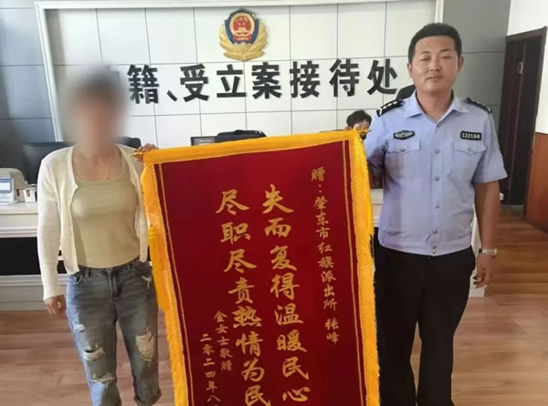 9月2日上午,哈爾濱市民金女士來到肇東市公安局紅旗派出所,將一面繡有“失而復(fù)得溫暖民心 盡職盡責(zé)熱情為民”的錦旗交到民警手中,感謝民警幫助她找回遺失的手機。