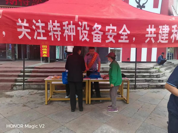 肇東市市場監管局特種設備安全監察股股長勾成文和特種設備監察人員,在商業聚集區設立宣傳臺,懸掛宣傳橫幅,發放相關宣傳資料,向過往群眾宣貫《中華人民共和國特種設備安全法》、《黑龍江省電梯安全條例》、《電梯維護保養服務規范》等相關法律法規和安全使用知識。現場解答群眾提問、為群眾普及知識,答疑解惑,引導群眾積極參與特種設備安全群防共治,切實提高群眾特種設備安全意識和應急防范能力。