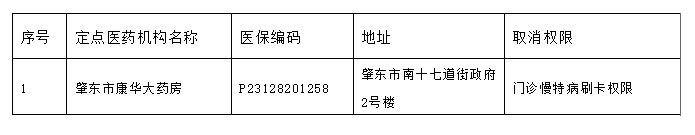 根據《國家醫療保障局令(第2號)》《國家醫療保障局令(第3號)》《綏化市醫療保障定點醫療機構服務協議》《綏化市醫療保障定點零售藥店服務協議》《綏化市基本醫療保險定點醫療機構定點零售藥店管理辦法》的相關規定,現對零售藥店作出取消門診慢特病刷卡決定,公示如下: