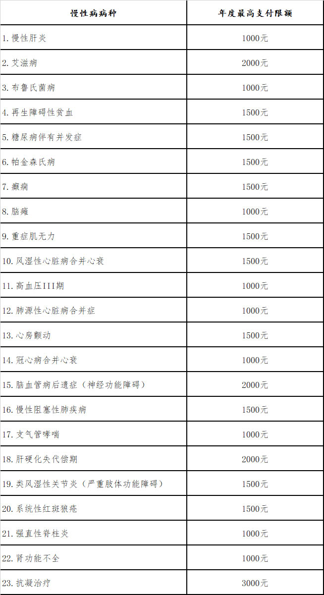 1.門診慢性病基本醫保報銷不設起付線,醫保政策范圍內合規費用統籌基金支付70%,年度最高支付限額見上表。