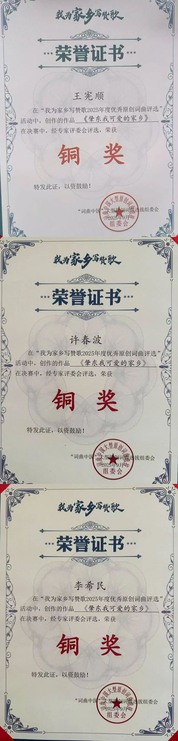 近日,“我為家鄉(xiāng)寫贊歌2025年度優(yōu)秀原創(chuàng)詞曲評選”全國決賽落下帷幕,肇東本土創(chuàng)作團隊交出亮眼答卷——由王憲順、許春波作詞,李希民作曲的《肇東我可愛的家鄉(xiāng)》憑借濃郁的地域風(fēng)情與動人的情感表達,成功斬獲銅獎。