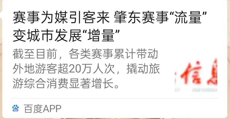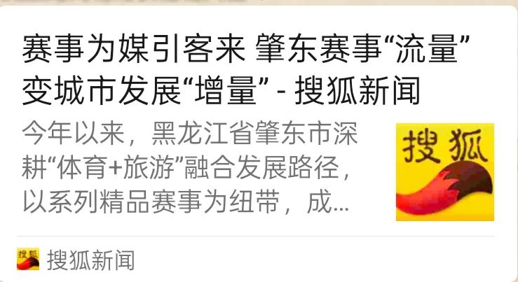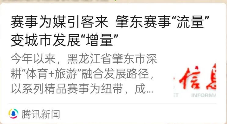 近日,肇東市以系列精品賽事為核心的文體旅融合發展模式引發多家媒體集中關注,今日頭條、騰訊新聞、搜狐新聞、百度、市場信息報信息快訊等多家媒體相繼聚焦其賽事經濟成效進行專題報道,讓肇東“以賽促游、以游興城”的發展故事成為矚目焦點,賽事經濟成為城市的新名片。