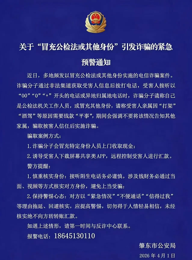 肇東市公安局:關于“冒充公檢法或其他身份”引發詐騙的緊急預警通知! 肇東市公安局:關于“冒充公檢法或其他身份”引發詐騙