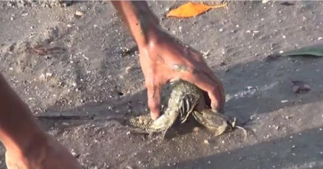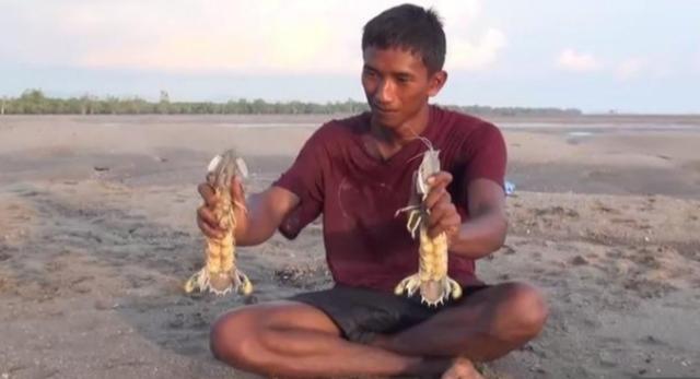 他小伙也不甘落后,紛紛跟著來捉蝦,圖中是一個(gè)小伙的成果! 瀨尿蝦也叫螳螂蝦。沒想到這種蝦不是和其他蝦一樣生活在海底,而是生活在海灘的泥洞里,他們常在淺海沙底或泥沙底掘穴,穴多為「U」字形。