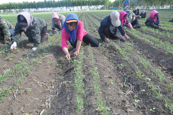 圖為6月17日,農民按綠色有機農產品標準為種植的谷子手工除草、淺鋤、松土及定苗作業。