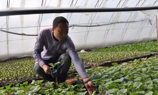 近日,肇東市五站鎮綠園農業生態種植園技術員李曉峰在查看用有機質育苗,等待移栽的黃瓜秧苗。