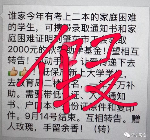 近日,一則內(nèi)容為“誰(shuí)家今年有考上二本的家庭困難的學(xué)生,可攜帶錄取通知書和家庭困難證明到市工會(huì)領(lǐng)取2000元的秋季助學(xué)基金”的消息在微信朋友圈和群聊中頻頻傳播,并引發(fā)關(guān)注。